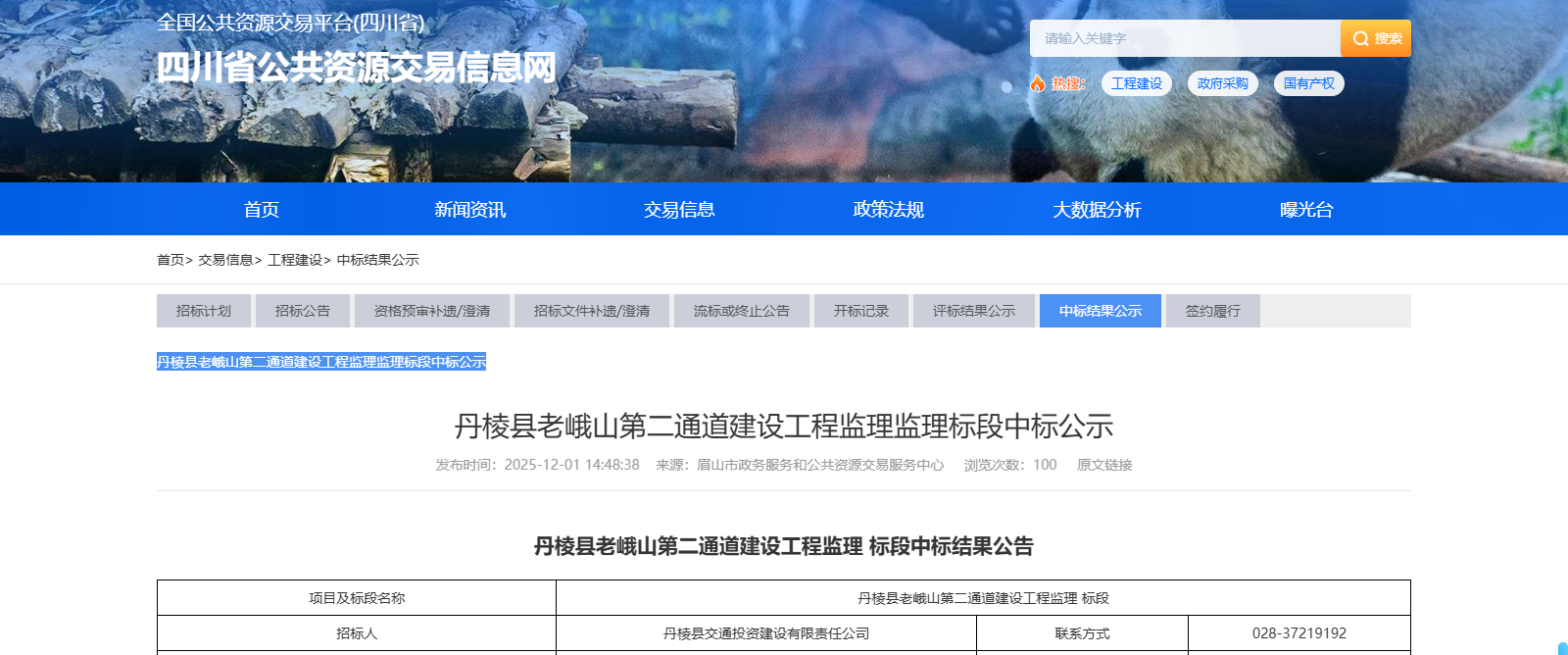 丹棱县老峨山第二通道建设工程监理监理标段中标公示