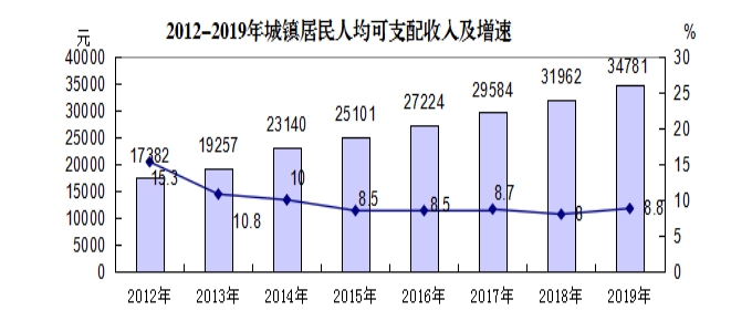 城镇居民收支 全年城镇居民人均可支配收入34781元,同比增加2819元,增长8.8%,其中,工资性收入18076元,增长8.8%;经营净收入12432元,增长8.2%。人均消费支出22462元,增长11%。城镇居民恩格尔系数为35.2%。