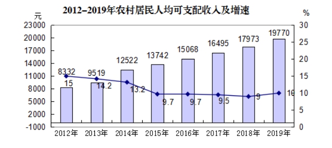 农村居民收支 全年农村居民人均可支配收入19770元,同比增加1797元,增长10.0%。其中,工资性收入7989元,增长9.5%;经营净收入10349元,增长11.1%;财产净收入601元,增长5.6%;转移净收入831元,增长5.6%。农村居民人均消费支出16394元,增长9.1%。农村居民恩格尔系数为34.3%。