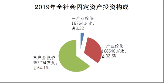 全年全社会投资按三次产业分,第一产业投资1.9亿元,下降61.7%;第二产业投资18.7亿元,同比下降12%;第三产业投资36.7亿元,同比增长48.3%。第一、二、三产业投资占全社会投资的比重分别为3.3%、32.6%、64.1%。