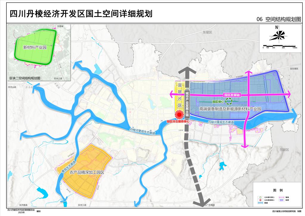 (一)规划结构。规划形成“一廊两心、三轴四区”的空间结构。“一廊”:依托丹棱河及其支流构建片区景观生态廊道。“两心”:结合区块一设置工业邻里中心,构建经开区公共服务核心;依托区块一坡地设置经开区公共绿化核心。“三轴”:依托丹棱大道形成城市产业发展轴,依托两条园区干道形成的园区发展轴,串联园区各功能片区。“四区”:依托不同区位以及产业特色形成的四大功能片区,分别为丹棱大道以西的宜居片区、高端装备制造及新能源新材料产业园、农产品精深加工园区、新材料产业园。
