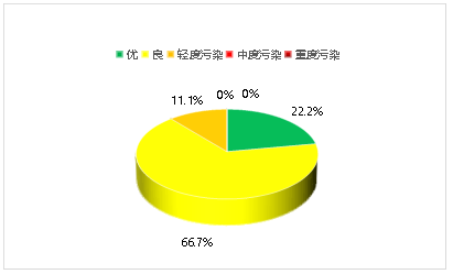 按照《环境空气质量标准》(GB3095-2012)评价丹棱县城区一季度总体优良天数比例为88.9%,其中优为22.2%,良为66.7%;总体污染天数比例为11.1%,其中轻度污染为11.1%,中度污染为0,重度污染为0。总体优良天数比例环比下降7.8个百分点,同比上升3.3个百分点。本季度首要污染物为细颗粒物。