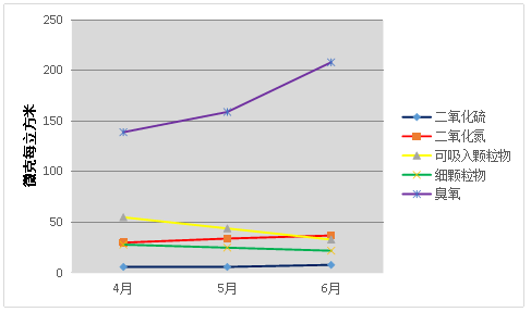 臭氧:最大日均浓度值为251微克每立方米;季均浓度值为166微克每立方米。