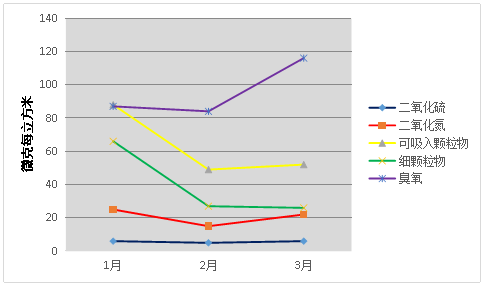 臭氧:最大日均浓度值为201微克每立方米;季均浓度值为91微克每立方米。