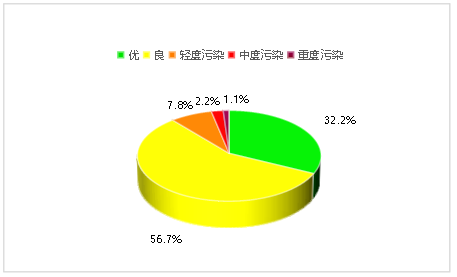 按照《环境空气质量标准》(GB3095-2012)评价丹棱县城区一季度总体优良天数比例为88.9%,其中优为32.2%,良为56.7%;总体污染天数比例为11.1%,其中轻度污染为7.8%,中度污染为2.2%,重度污染为1.1%。总体优良天数比率环比下降6.8个百分点,同比上升1个百分点。本季度首要污染物为可吸入颗粒物。
