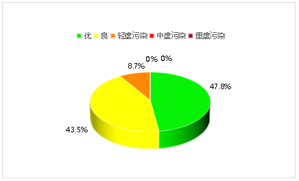 按照《环境空气质量标准》(GB3095-2012)评价丹棱县城区三季度总体优良天数比例为91.3%,其中优为47.8%,良为43.5%;总体污染天数比例为8.7%,其中轻度污染为8.7%,中度污染为0%,重度污染为0%。总体优良天数比率环比上升16.6个百分点,同比上升14.1个百分点。本季度首要污染物为臭氧。