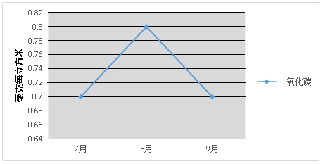 一氧化碳:最大日均浓度值为0.8毫克每立方米;季均浓度值为0.7毫克每立方米。