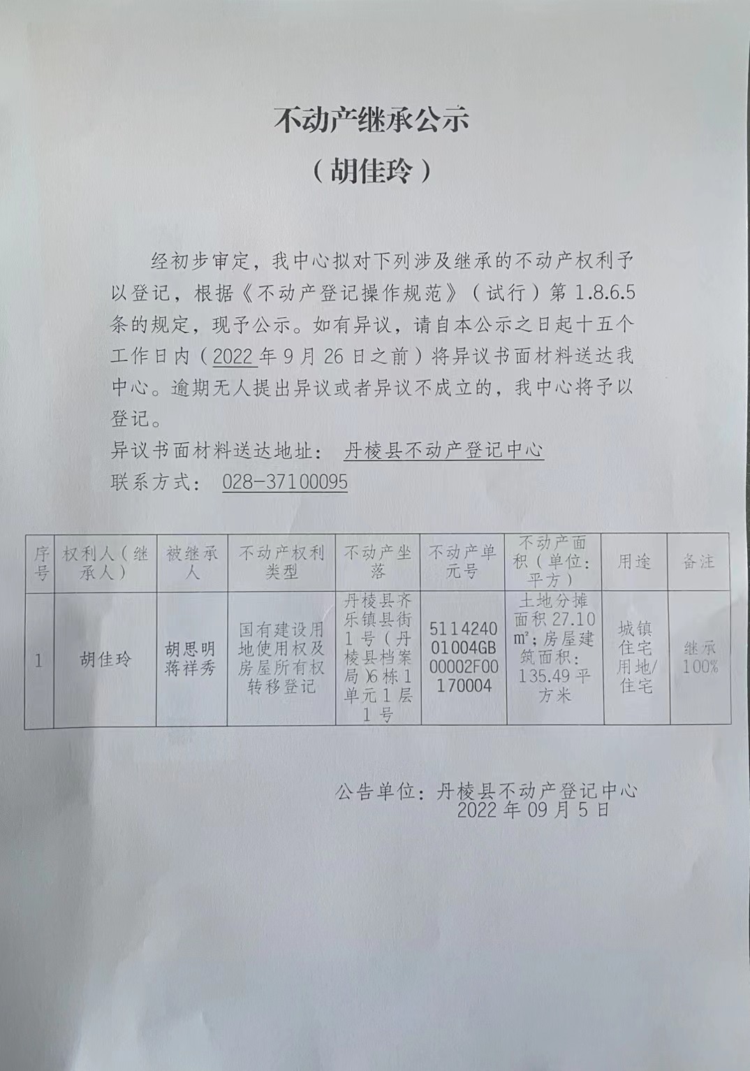 不动产继承公示(胡佳玲)