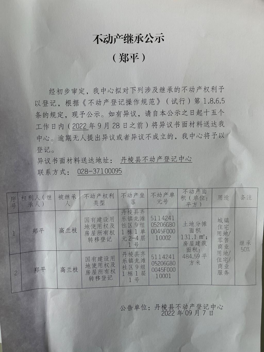 不动产继承公示(郑平)