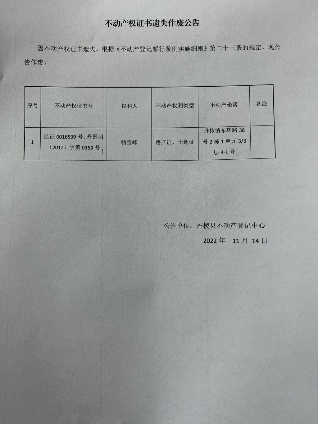 不动产权证书遗失作废公告(骆雪峰)