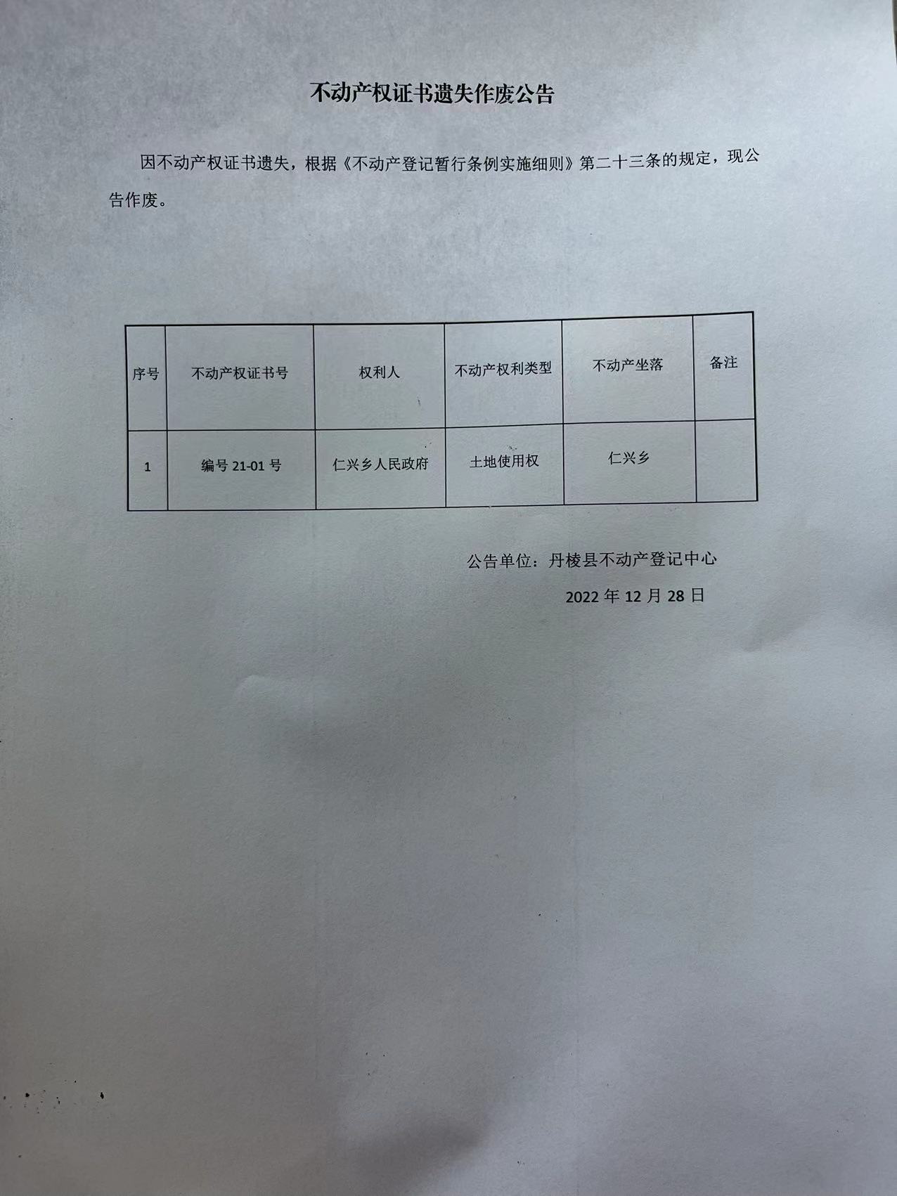 不动产权证书遗失作废公告(仁兴乡人民政府)