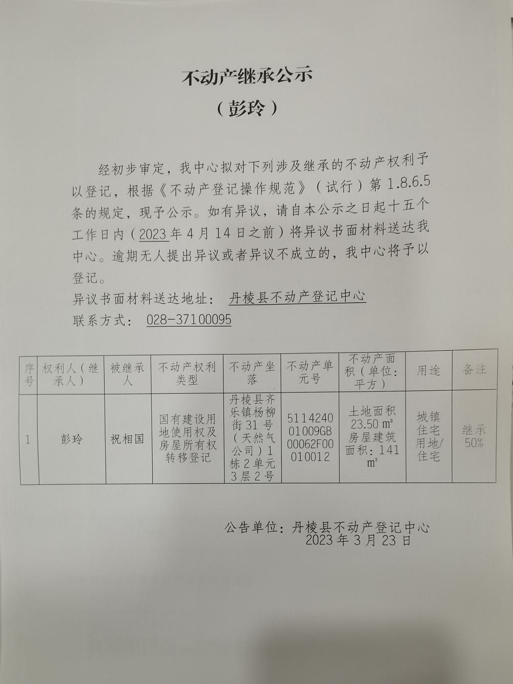 不动产继承公示(彭玲)