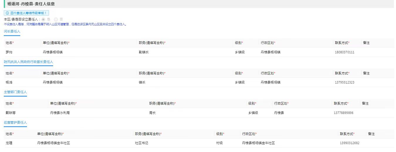 根据《四川省水利厅关于加强山区河道管理的通知》(川水函〔2023〕795号)要求,我局完成了杨场河山区河道信息复核填报,并建立了“河长责任人、行政首长责任人、主管部门责任人、巡查管护责任人”等“四个责任人”名单,现按照相关要求向社会公示。