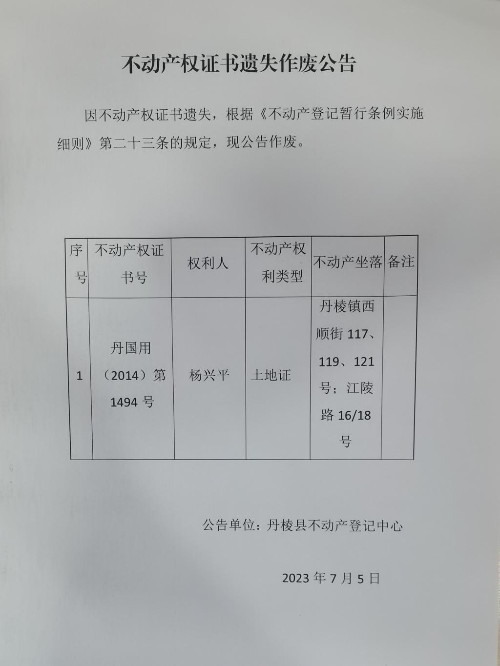 不动产权证书遗失作废公告(杨兴平)
