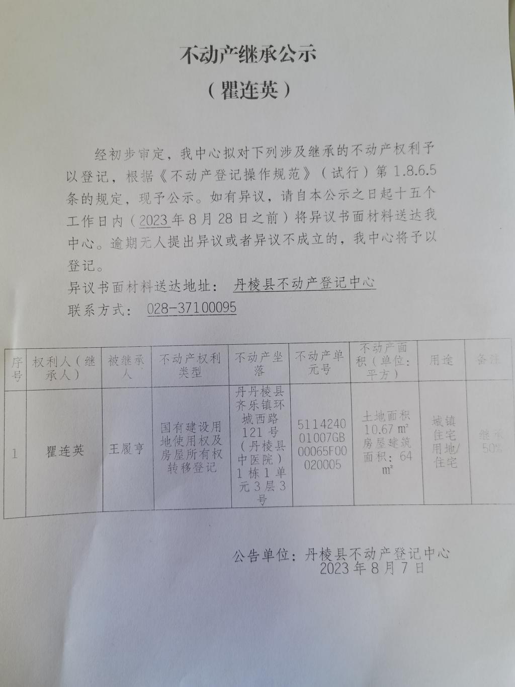 不动产继承公示(瞿连英)