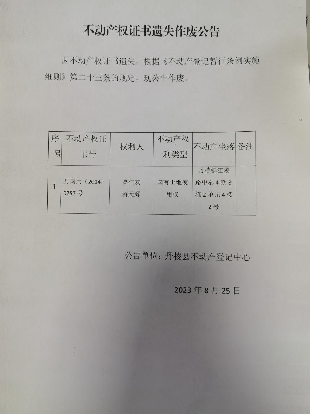 不动产权证书遗失作废公告(高仁友 蒋元辉)