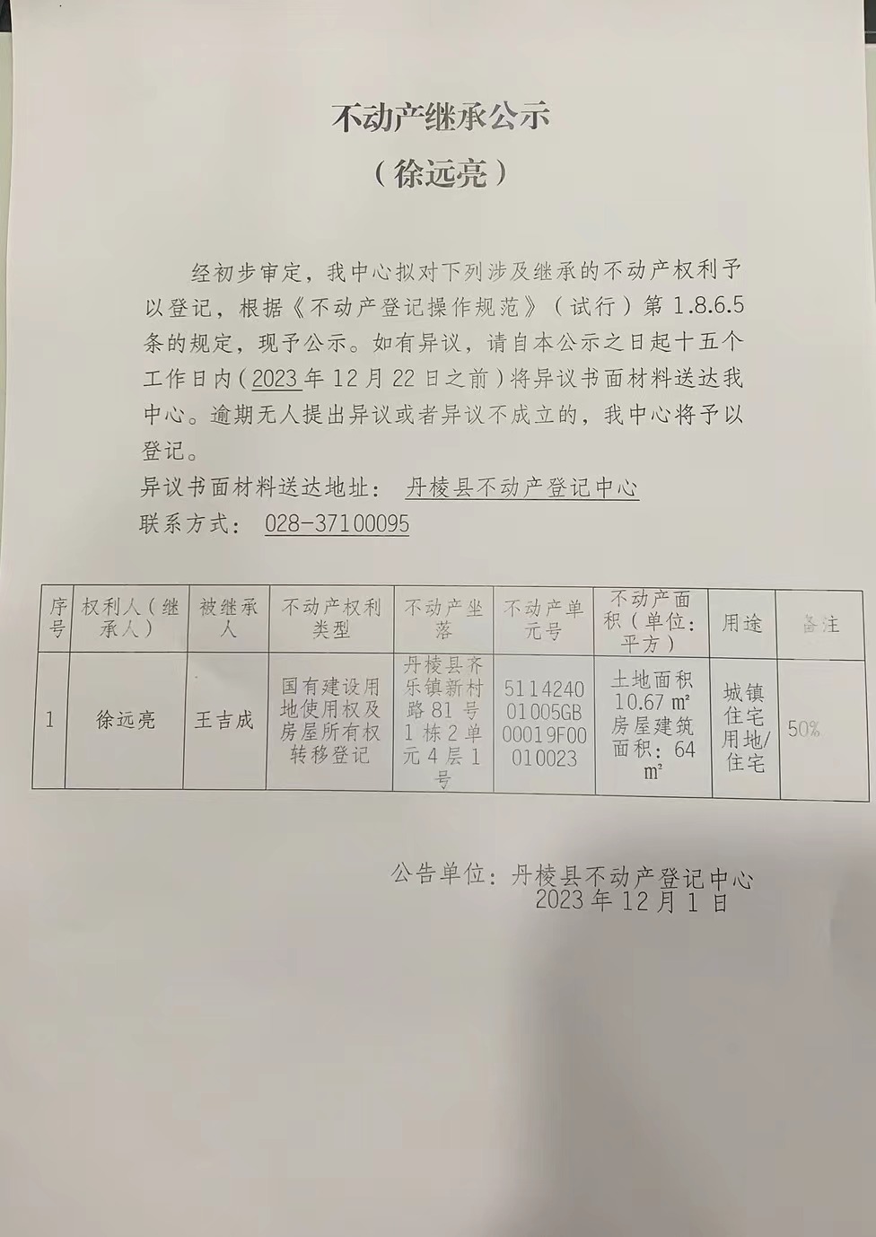 不动产继承公示(徐远亮))