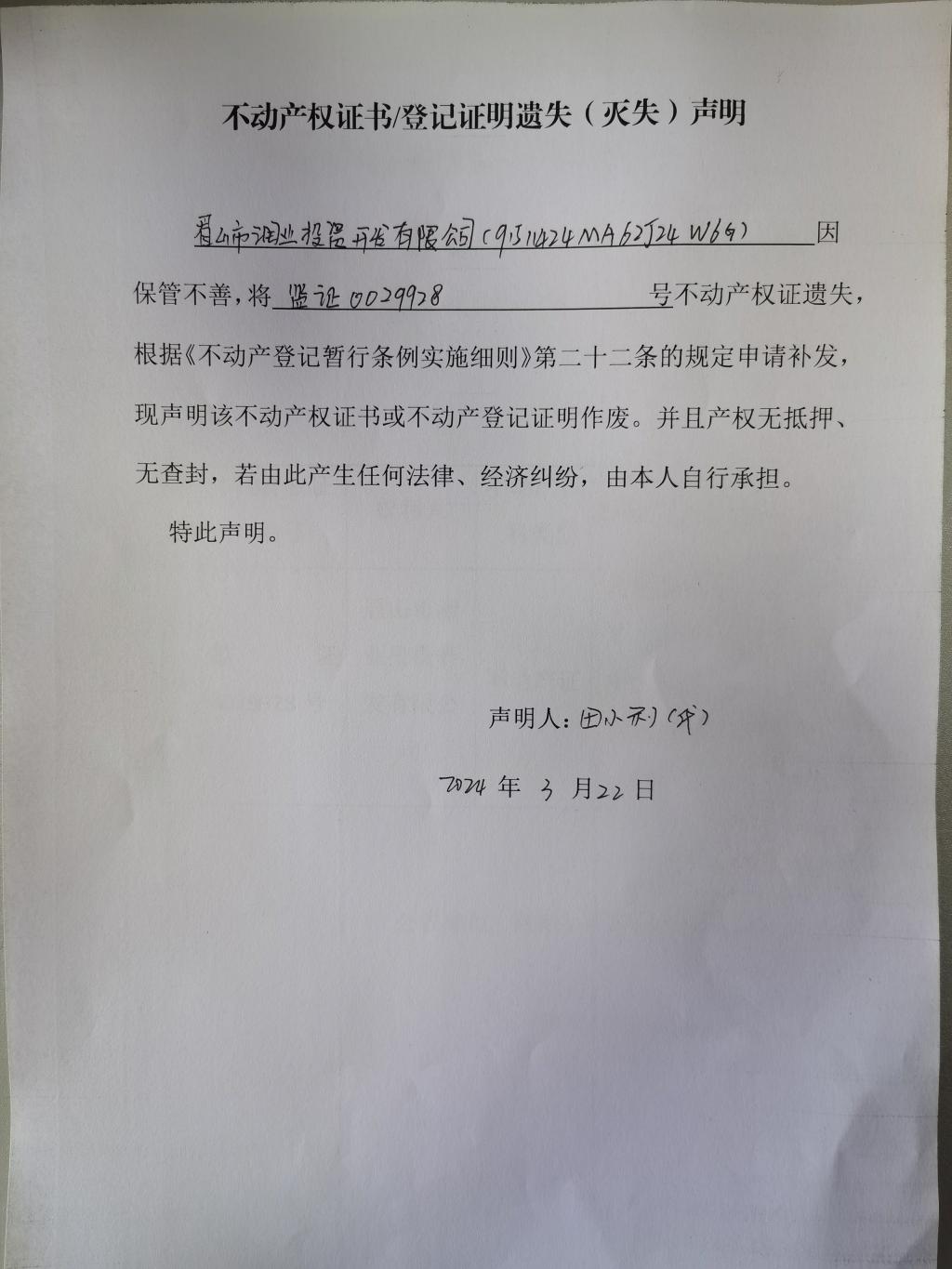 不动产权证书/登记证明遗失(灭失)声明(眉山市润业投资开发有限公司)