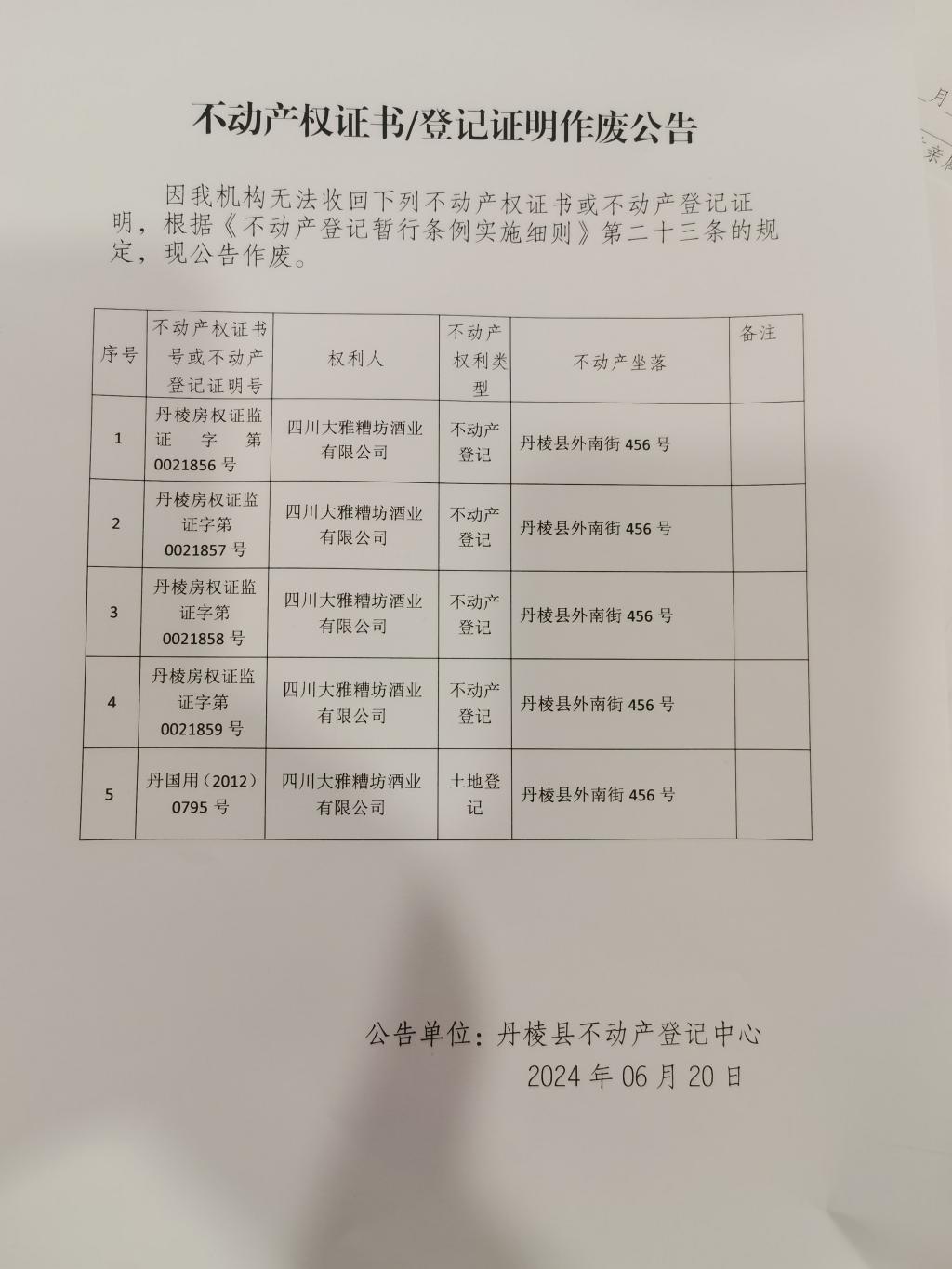 不动产权证书、登记证明作废公告(四川大雅糟房酒业有限公司)