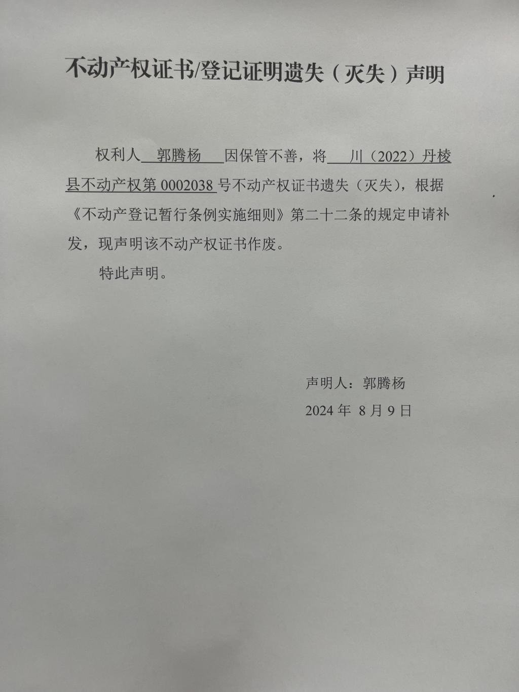 不动产权证书/登记证明遗失(灭失)声明(郭腾杨)