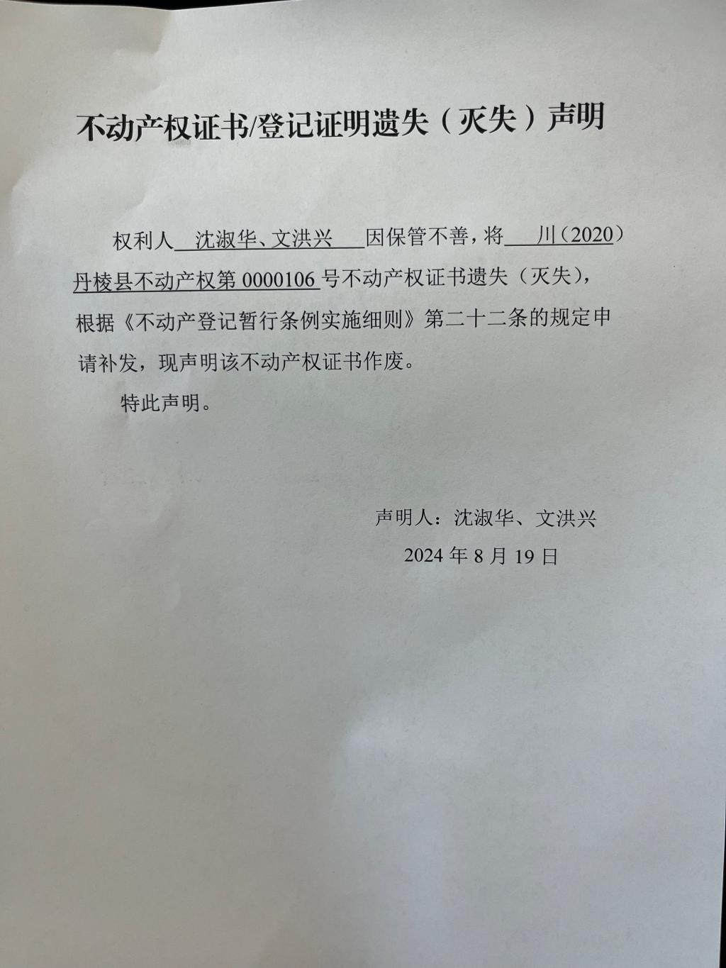 不动产权证书/登记证明遗失(灭失)声明(沈淑华、文洪兴)