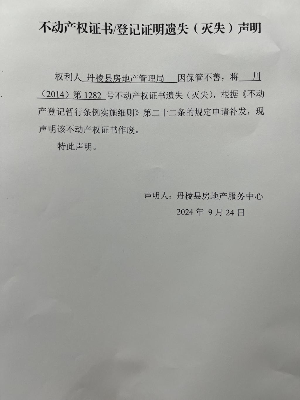 不动产权证书/登记证明遗失(灭失)声明(丹棱县房地产管理局)