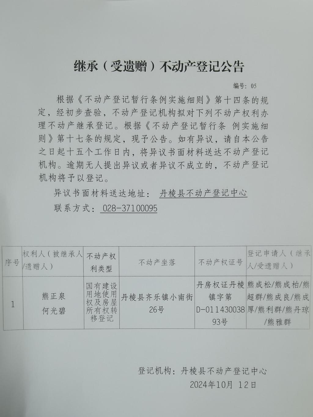 继承(受遗赠)不动产登记公告(熊正泉、何光碧)