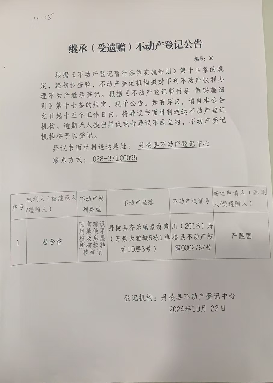 继承(受遗赠)不动产登记公告-易含香