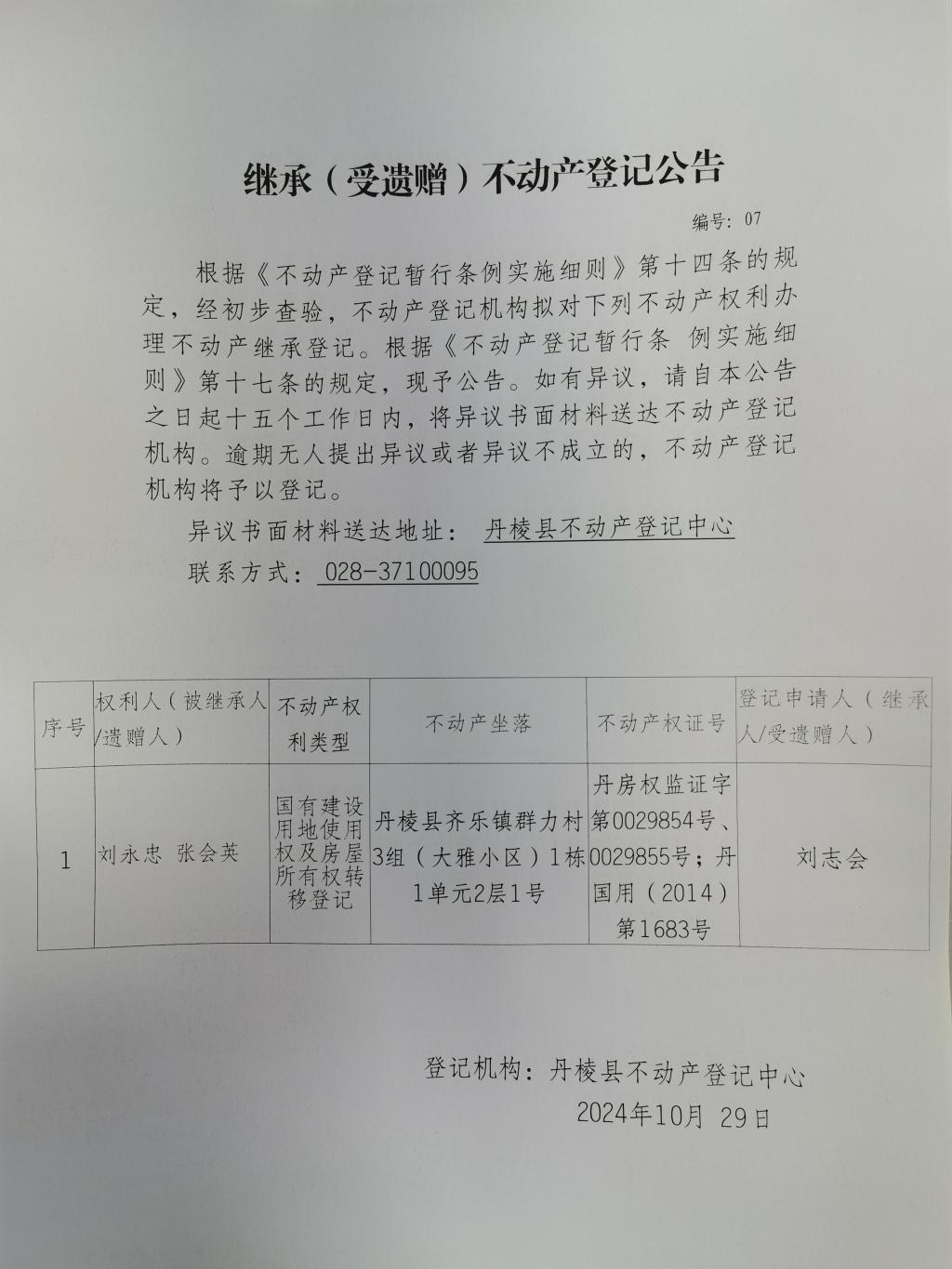 继承(受遗赠)不动产登记公告(刘永忠 张会英)