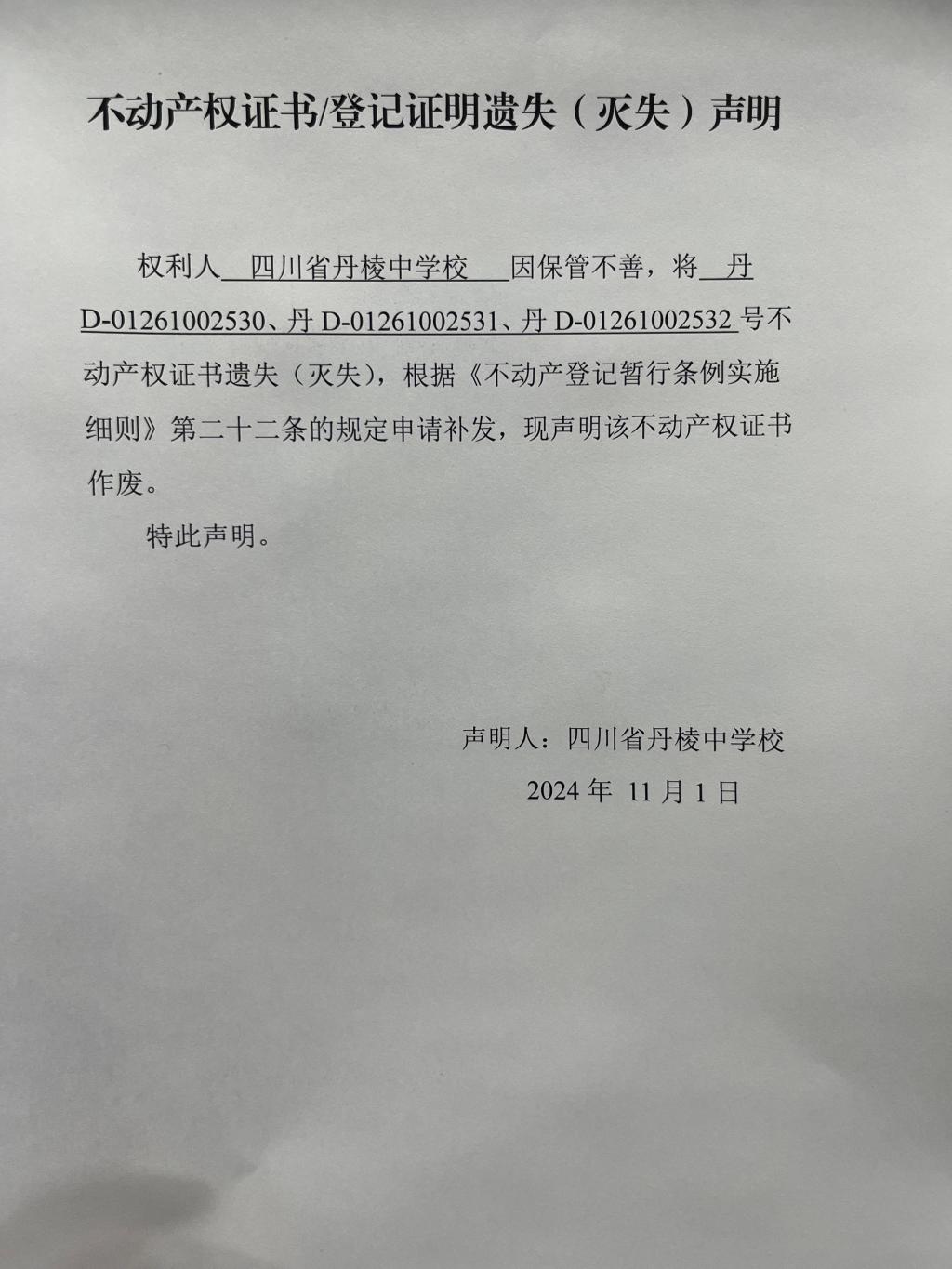 不动产权证书/登记证明遗失(灭失)声明(丹棱中学校)