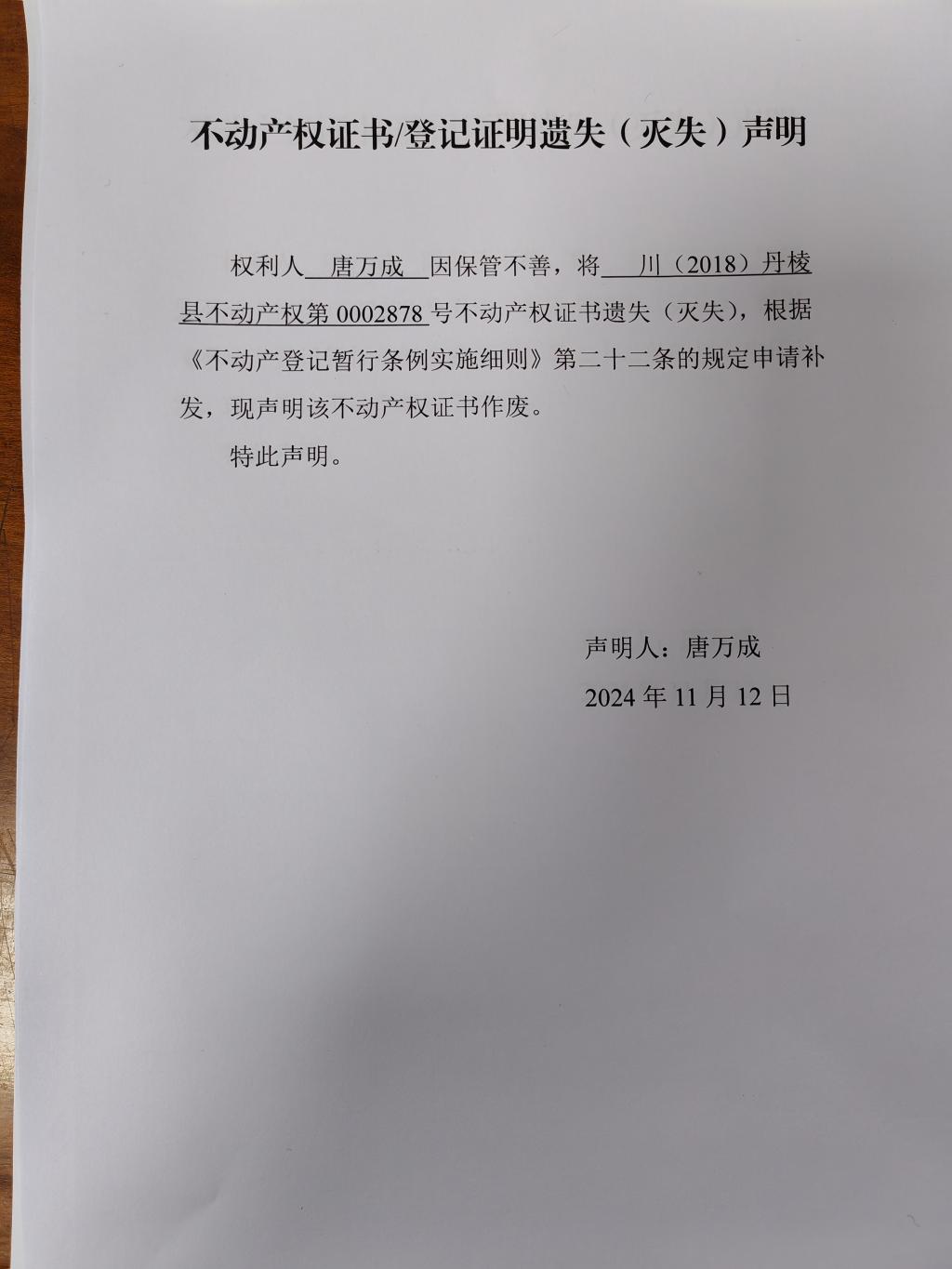 不动产权证书/登记证明遗失(灭失)声明(唐万成)