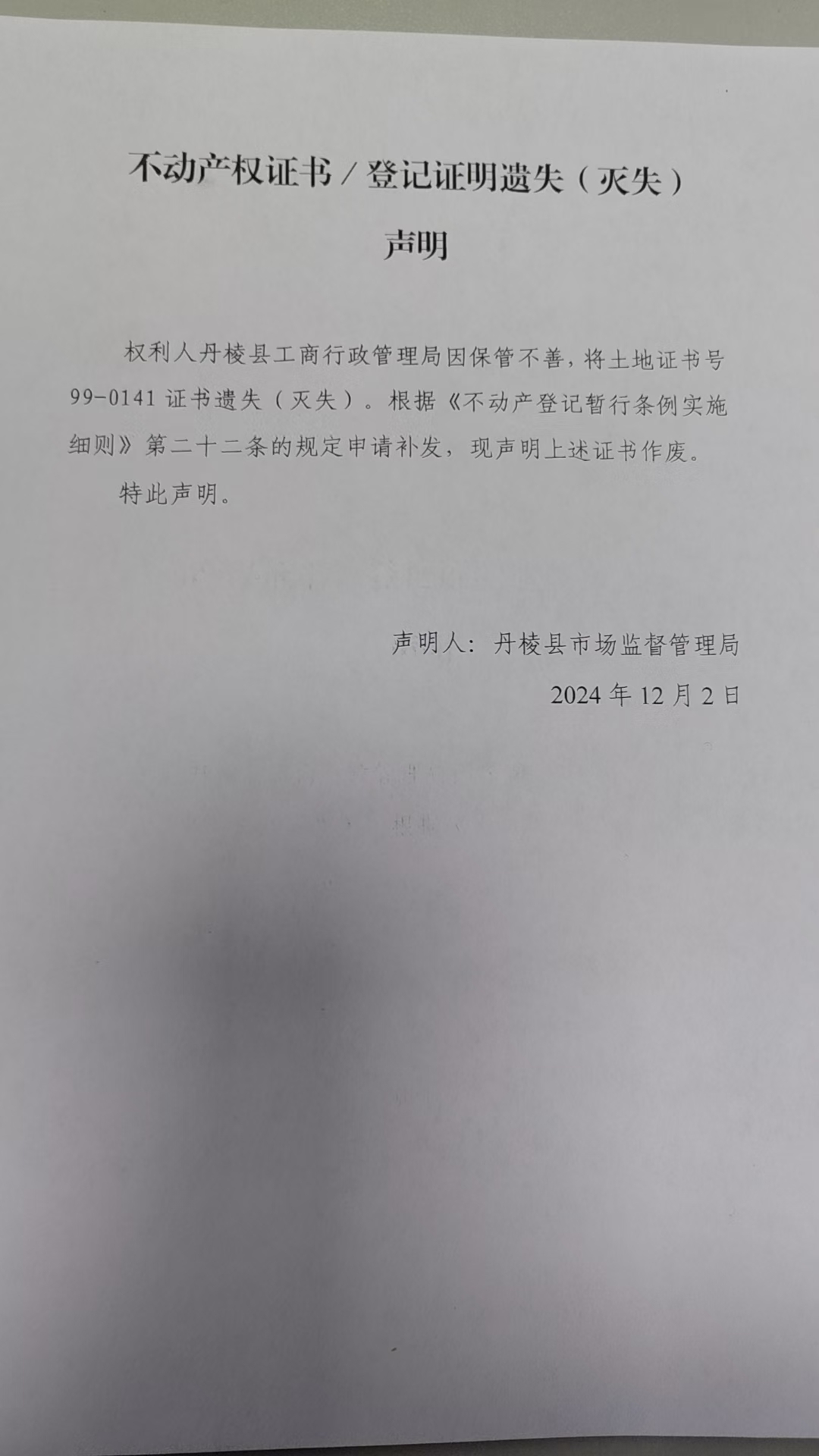 不动产权证书/登记证明遗失(灭失)声明(丹棱县工商行政管理局)