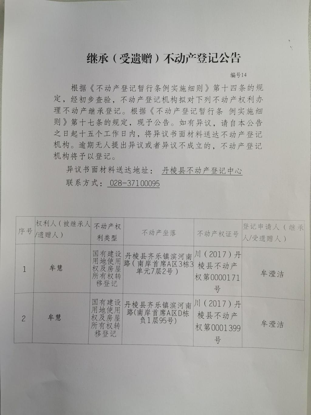 继承(受遗赠)不动产登记公告(牟滢洁)