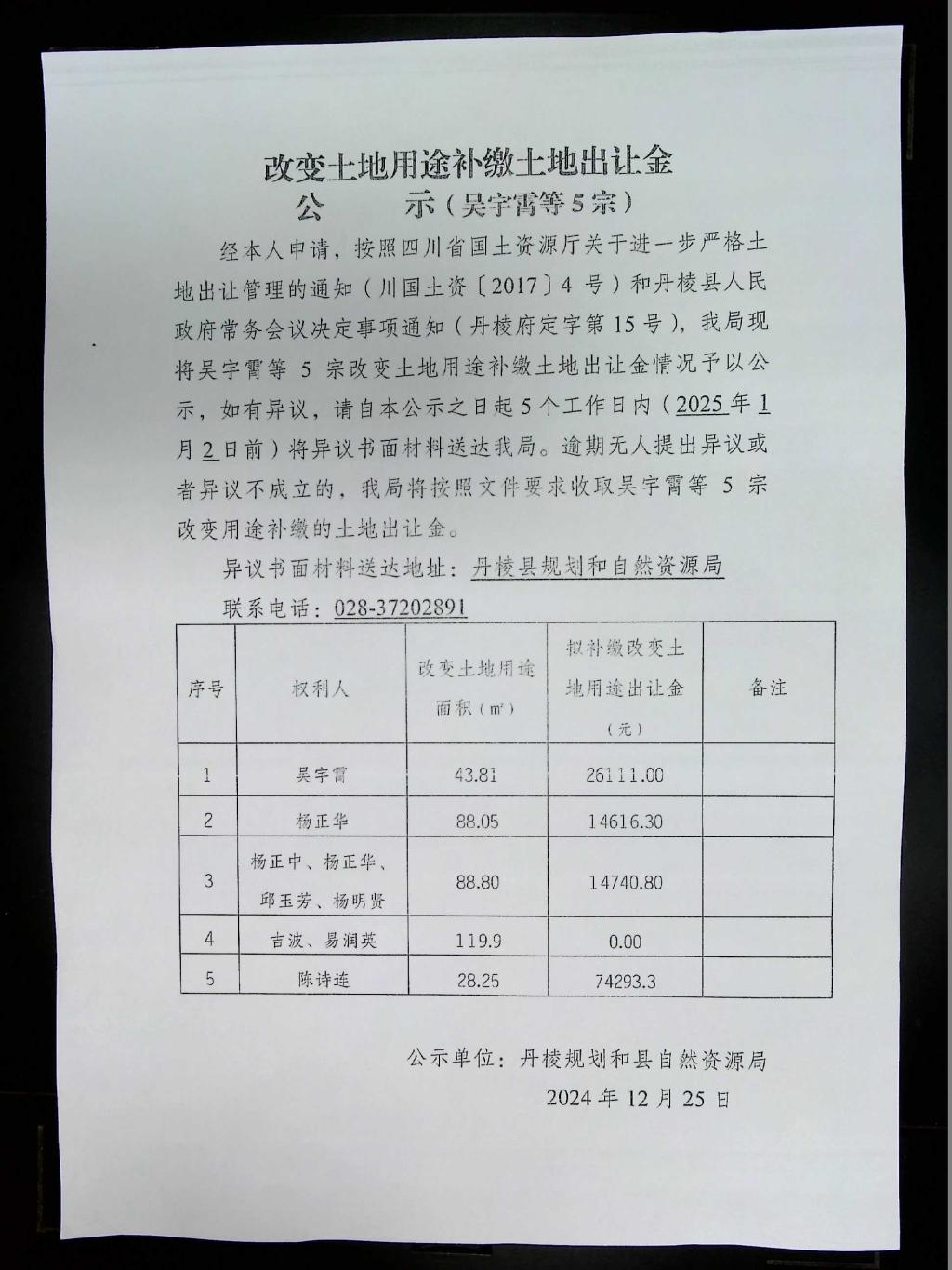 改变土地用途补缴土地出让金公示(吴宇霄等5宗)