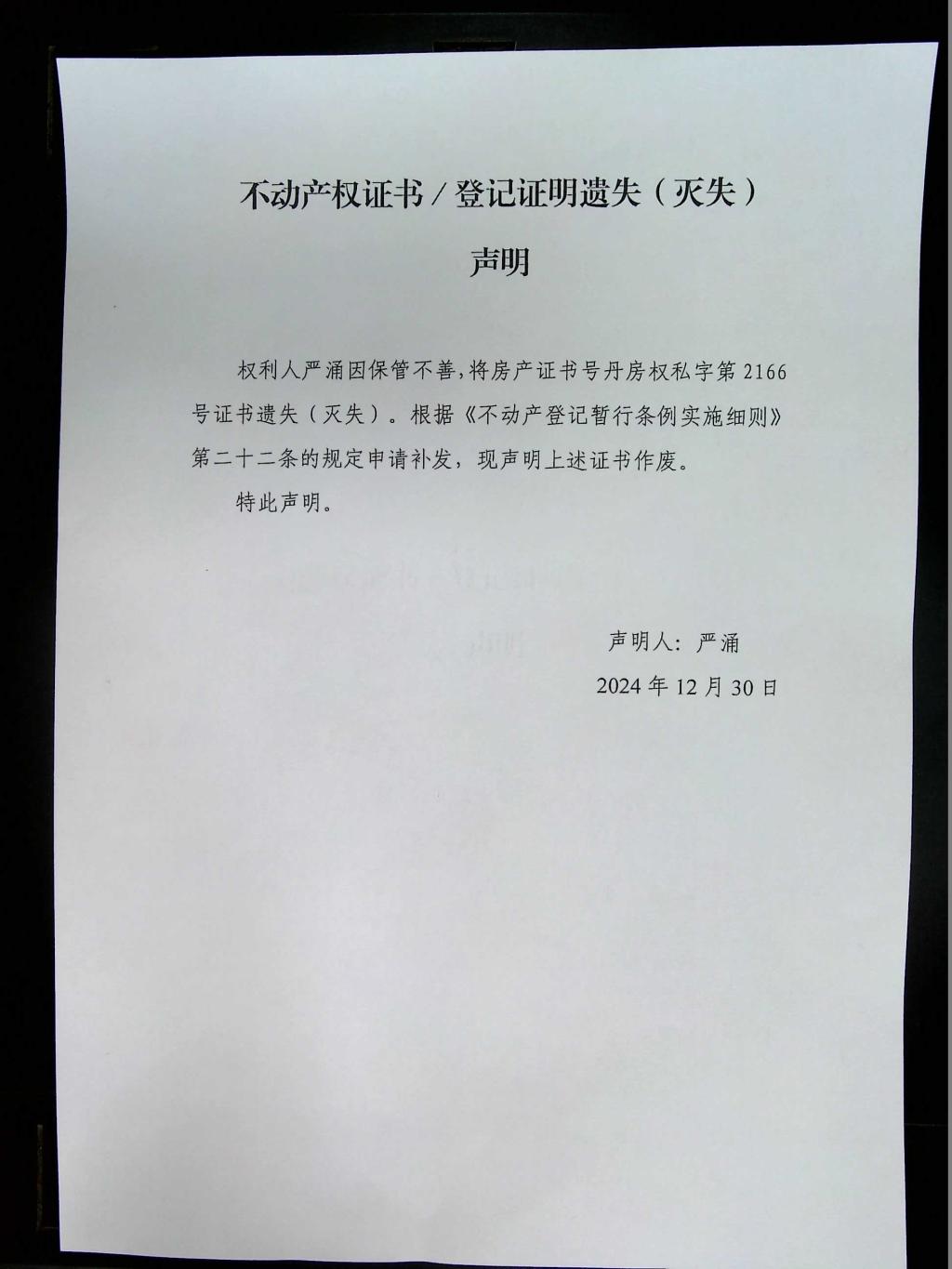 不动产权证书/登记证明遗失(灭失)声明(严涌)