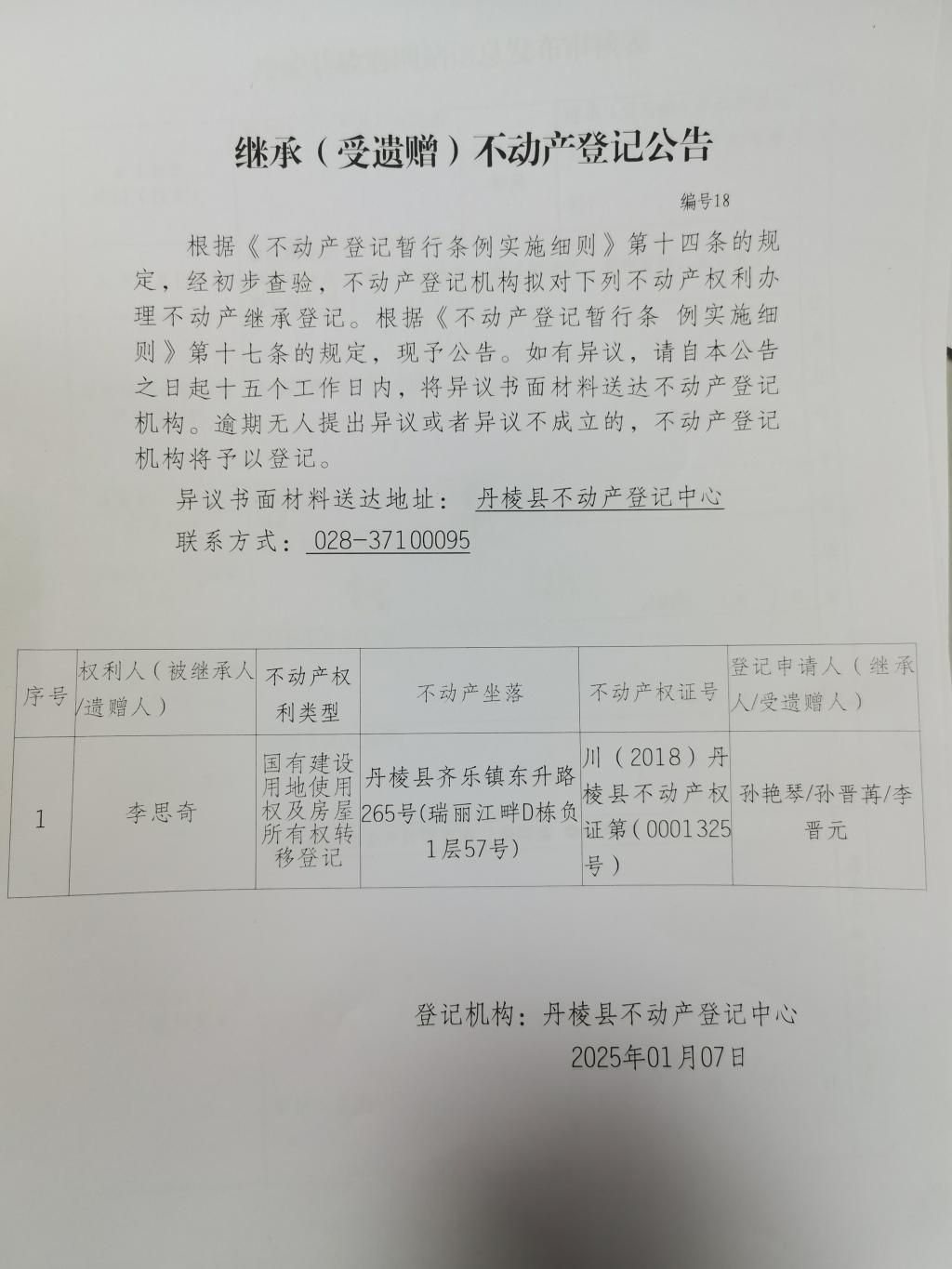 继承(受遗赠)不动产登记公告(孙艳琴/孙晋苒/李晋元)