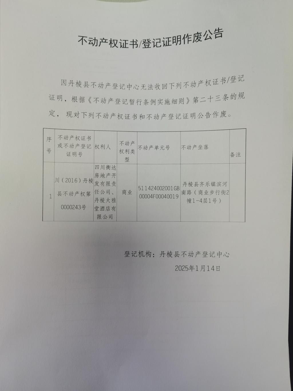 不动产权证书/登记证明作废公告(四川衡达房地产开发有限责任公司、丹棱大雅堂酒店有限公司)