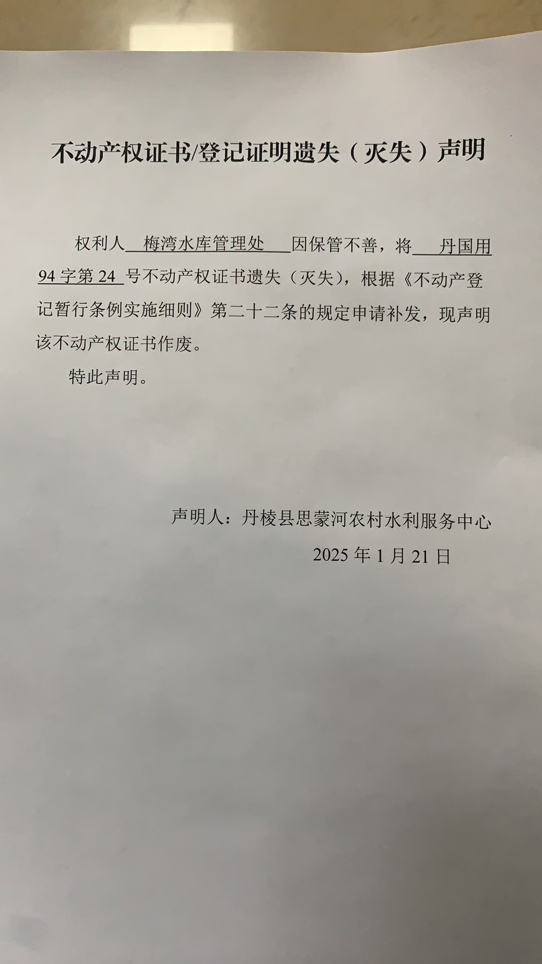 不动产权证书/登记证明遗失(灭失)声明(梅湾水库管理处)