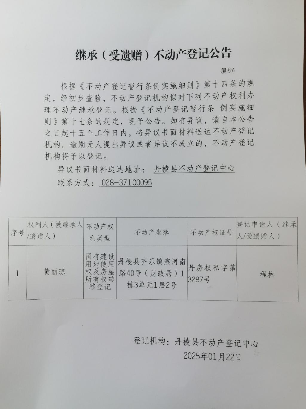 继承(受遗赠)不动产登记公告(程林)