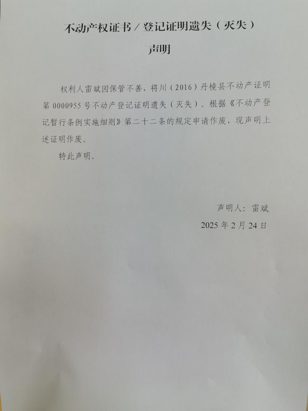 不动产权证书/登记证明遗失(灭失)声明(雷斌)