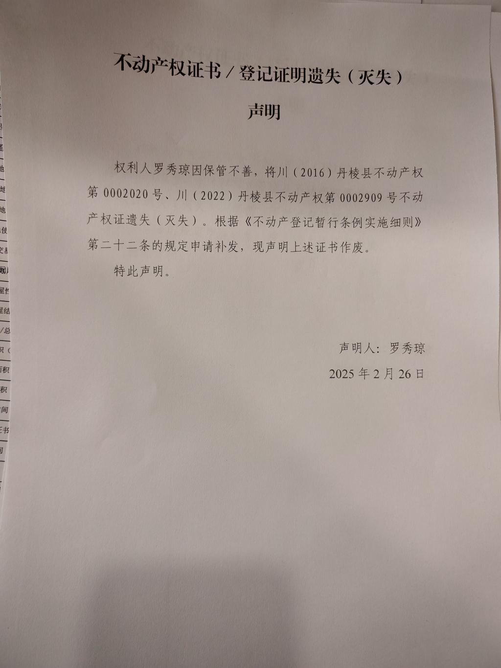 不动产权证书/登记证明遗失(灭失)声明(罗秀琼)