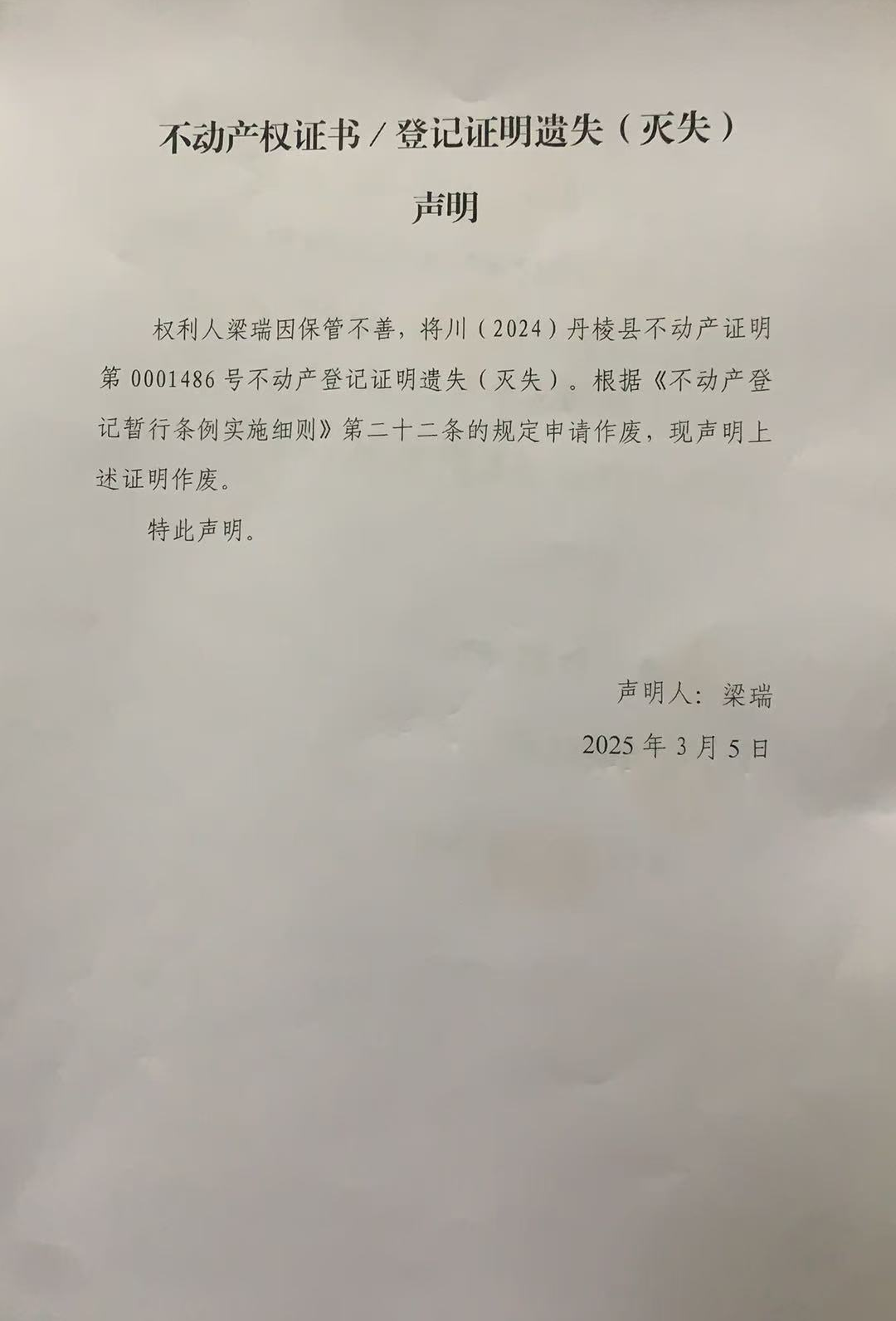 不动产权证书/登记证明遗失(灭失)声明(梁瑞)