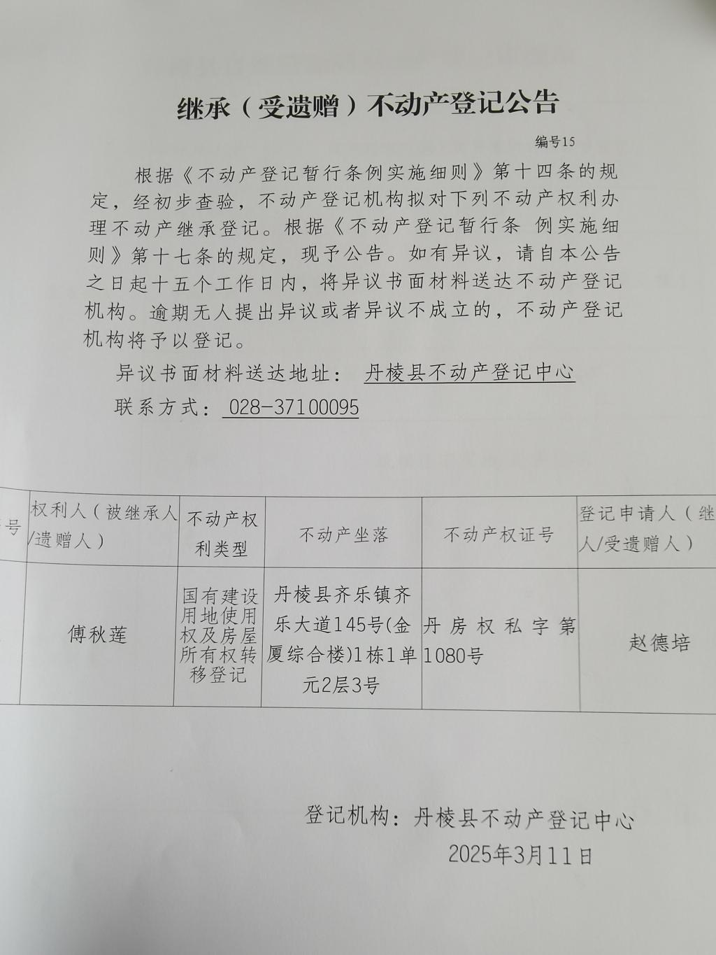 继承(受遗赠)不动产登记公告(傅秋莲)