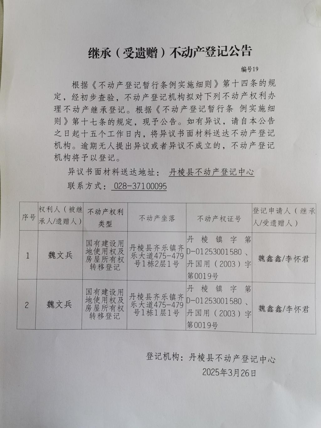 继承(受遗赠)不动产登记公告(魏鑫鑫、李怀君)