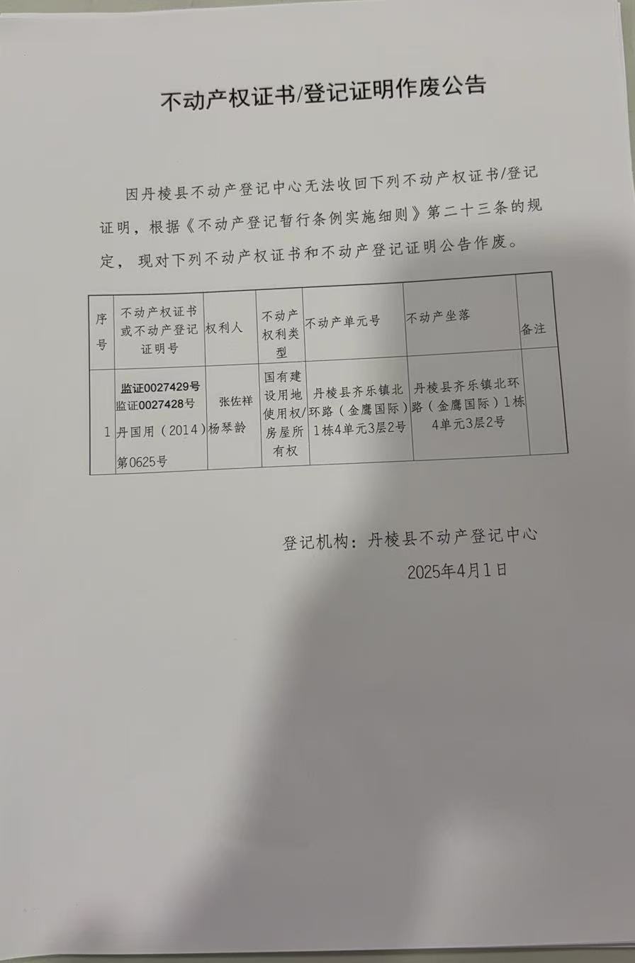 不动产权证书/登记证明作废公告(张佐祥 杨琴龄)