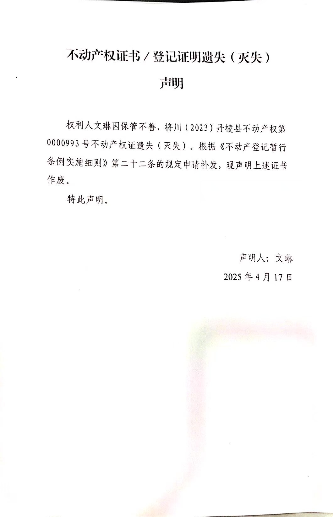 不动产权证书/登记证明遗失(灭失)声明(文琳)