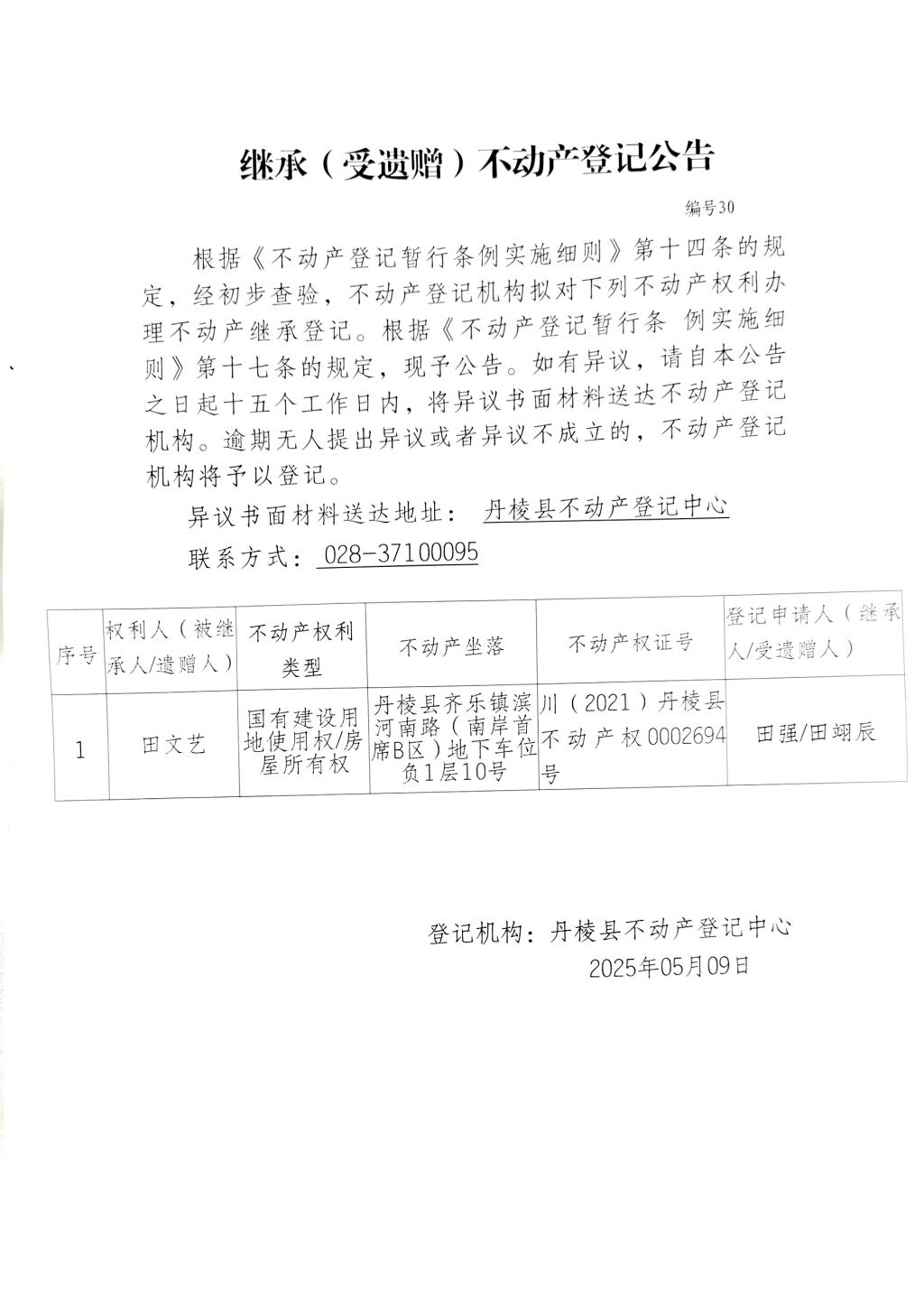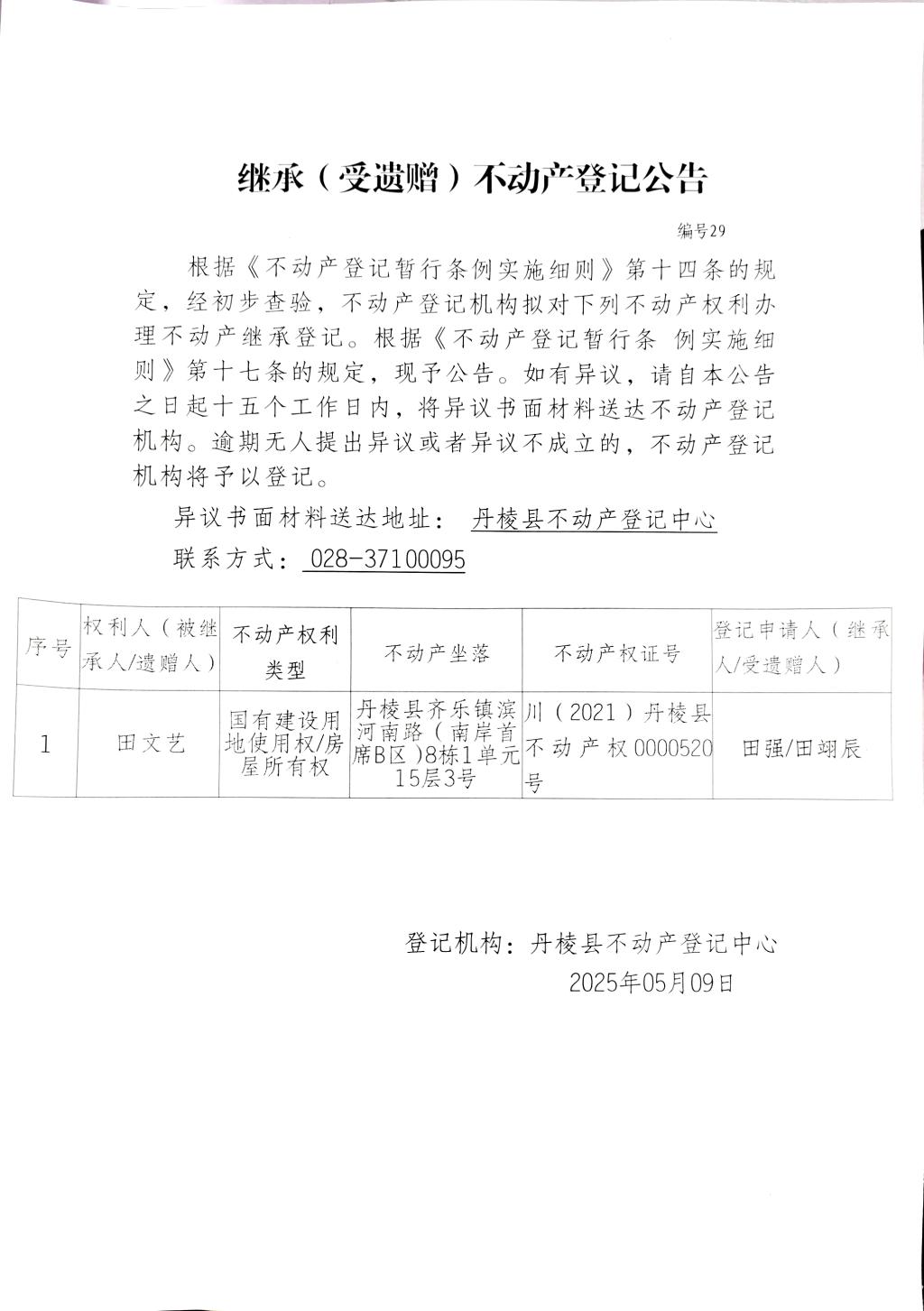 继承(受遗赠)不动产登记公告(田强/田翊辰)
