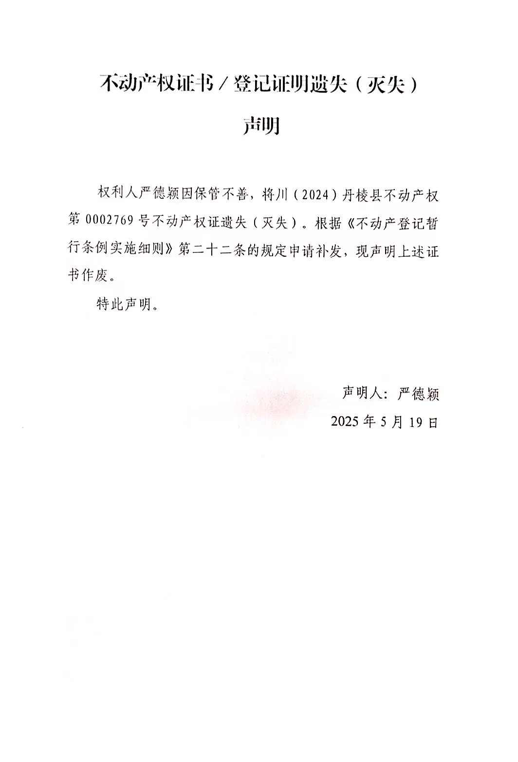不动产权证书/登记证明遗失(灭失)(严德颖)