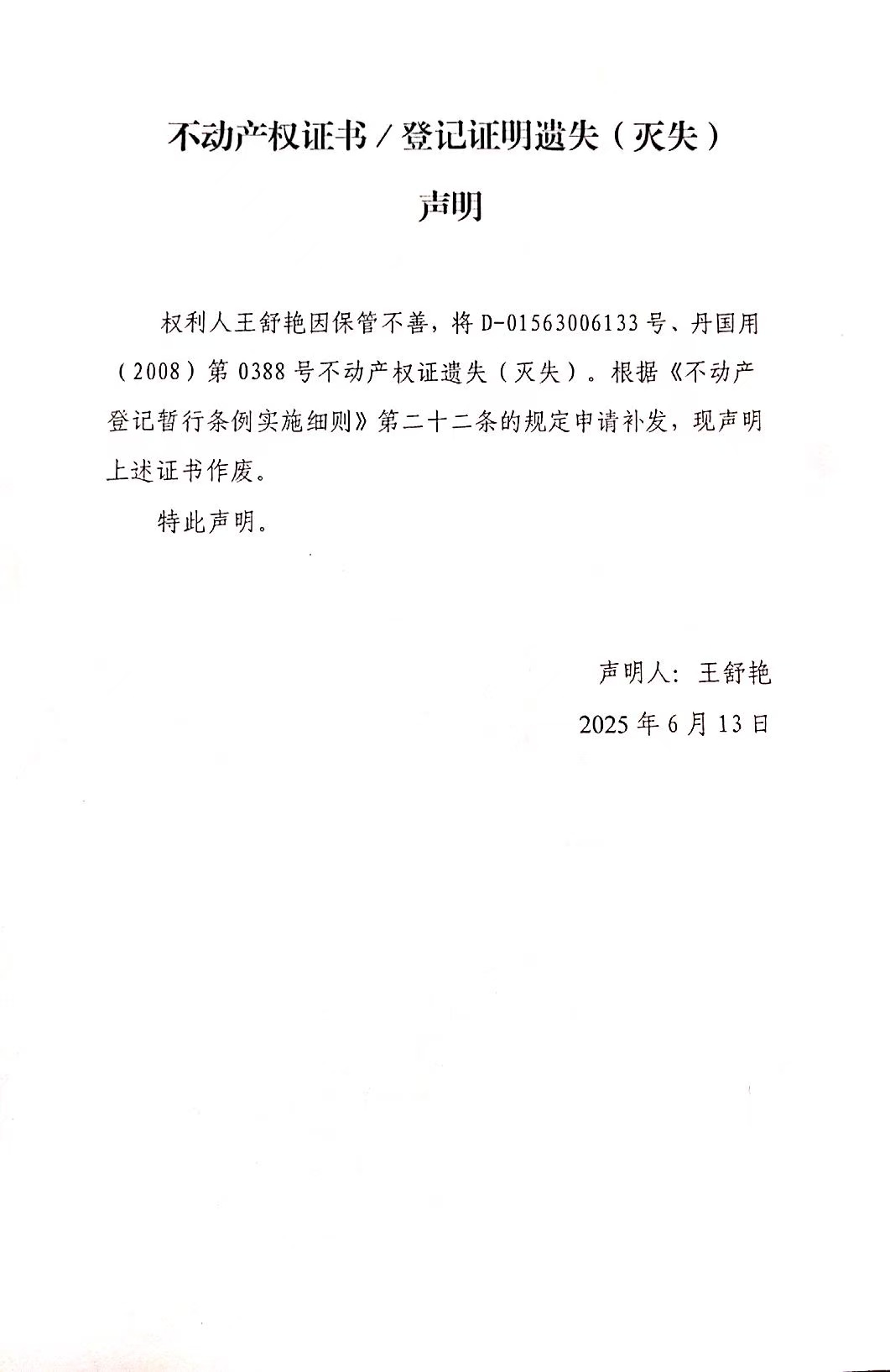 不动产权证书/登记证明遗失(灭失)声明(王舒艳)