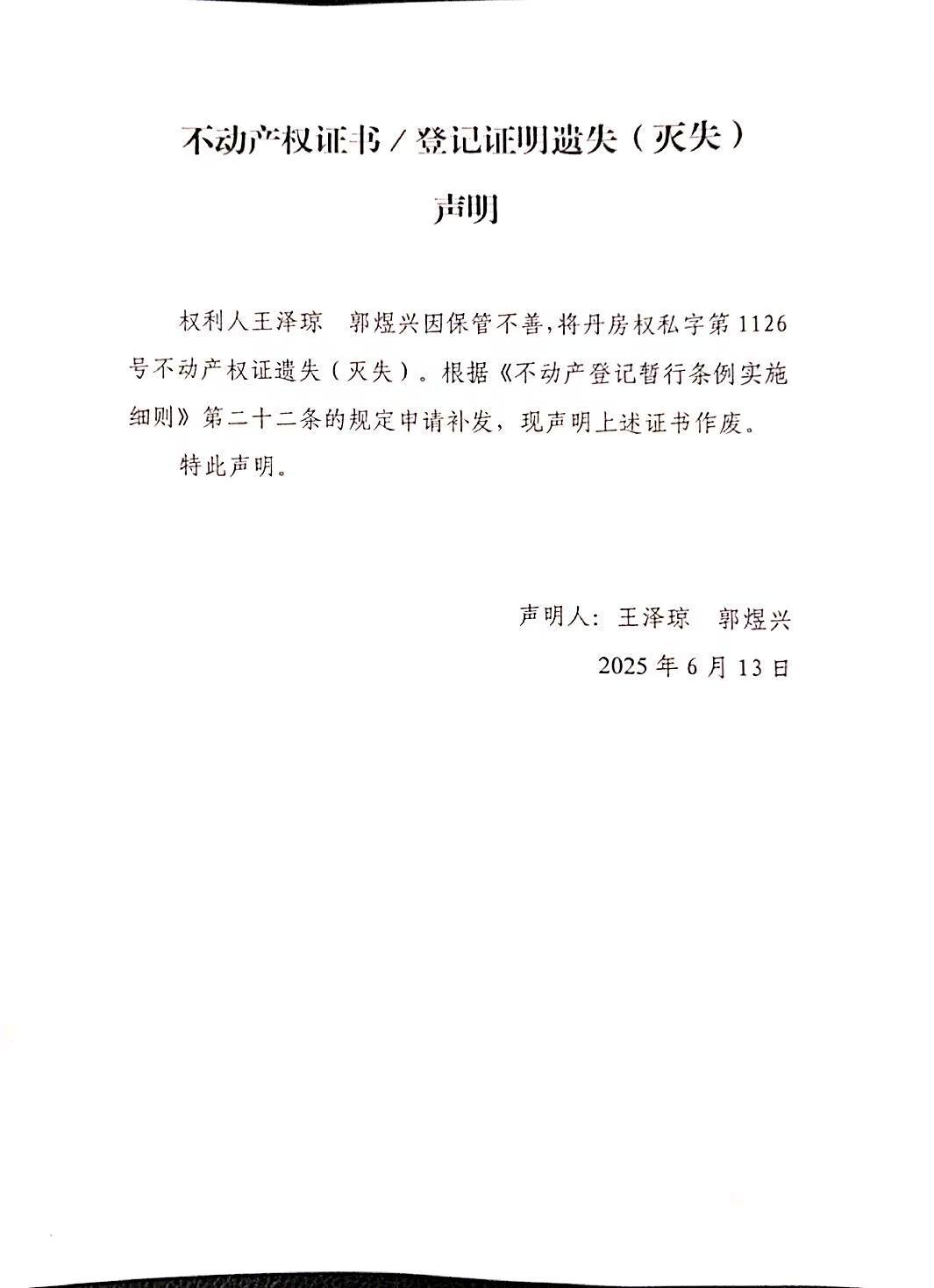 不动产权证书/登记证明遗失(灭失)声明(王泽琼、郭煜兴)